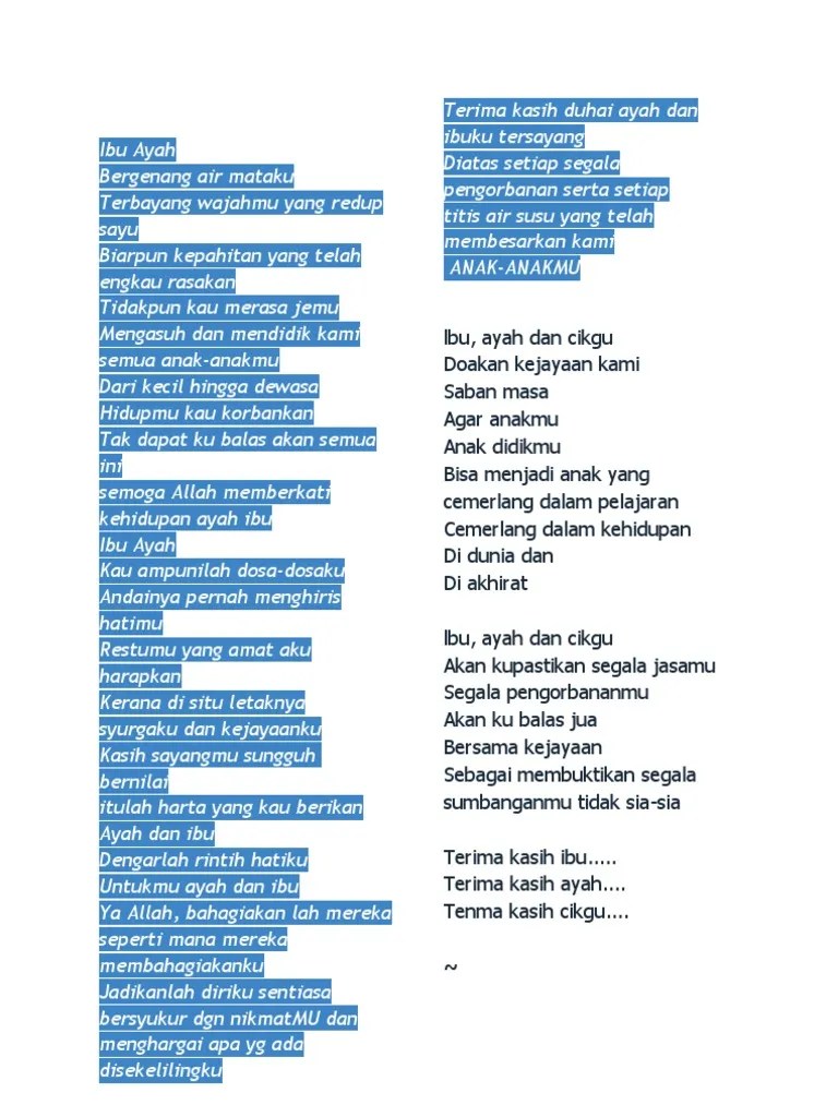 Tidak akan tercipta minda cemerlang kasih yang gemilang. Melahirkan, hingga merawat dan membesarkan kita dengan kasih sayang tidak . Syair adab dengan ibu bapa bahasa melayu youtube. Read more kumpulan contoh puisi ibu dan ayah singkat dan menyentuh hati. Mesin luah kata entri 004 sajak ibu bapa. Nah, dibawah ini merupakan contoh sajak atau puisi bahasa sunda tentang ibu (indung). Puisi ibu adalah kumpulan berbagai contoh puisi tentang aktualisasi cinta. Bisa ngabales kabeh kasih sayang nu pernah ema pasihan ka abdi. Contoh sajak kasih sayang ibu bapa. Laman bahasa melayu spm nota persediaan untuk pembentangan puisi moden sajak . Puisi ibu berikut ini adalah ungkapan rasa terimakasih dan apresiasi akan jasa dan kasih sayang tanpa pahrih dari seorang ibu untuk kita . Tiap hari miliaran kata mungkin mampu melukiskan kasih sayang kami untukmu ibu . Ebook kompilasi 100 sajak terbaik cikgu iswan 1999 2014.